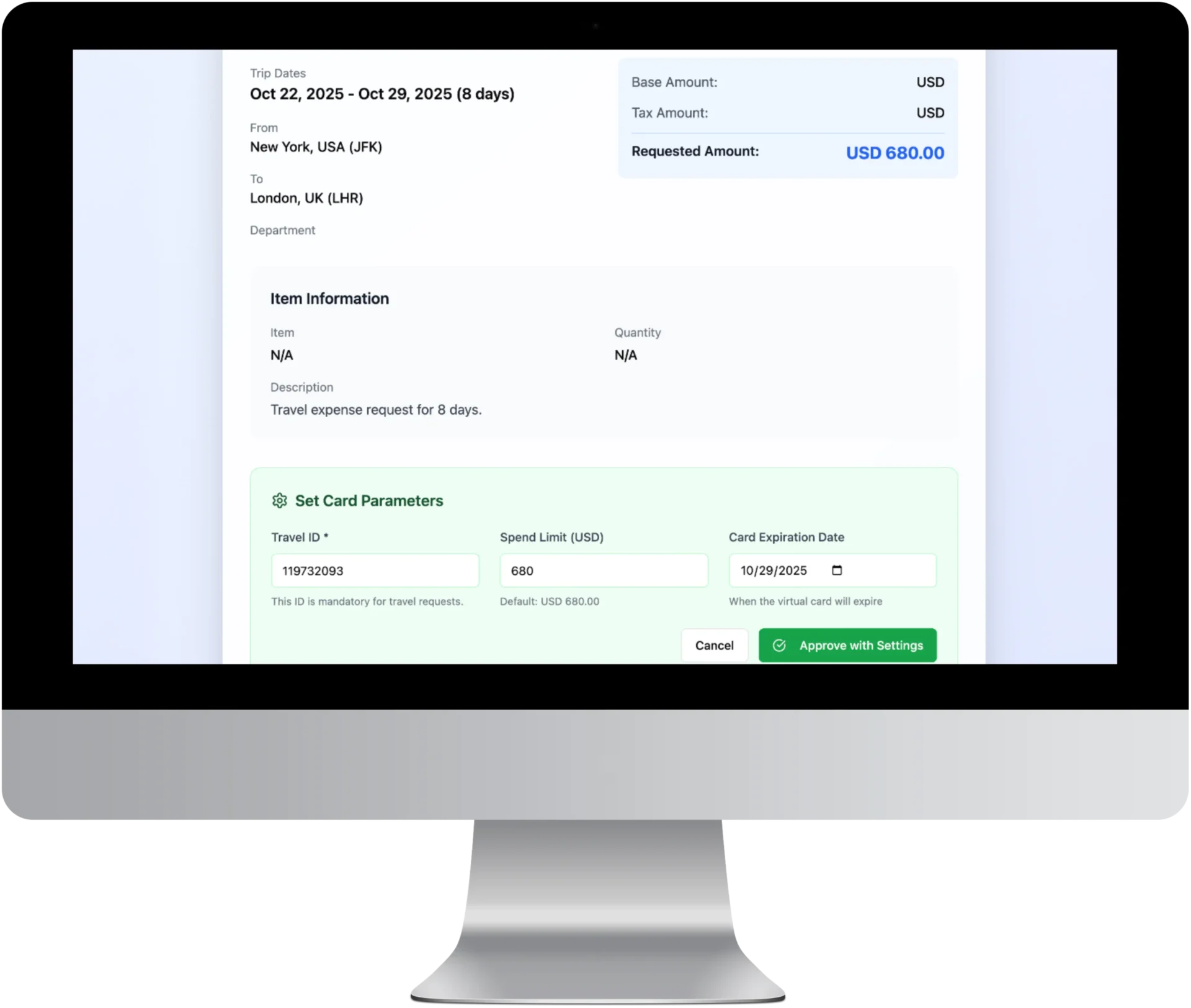 Instant issuance of a virtual Mastercard - branded with your company’s logo and ready to spend within the approved limits.