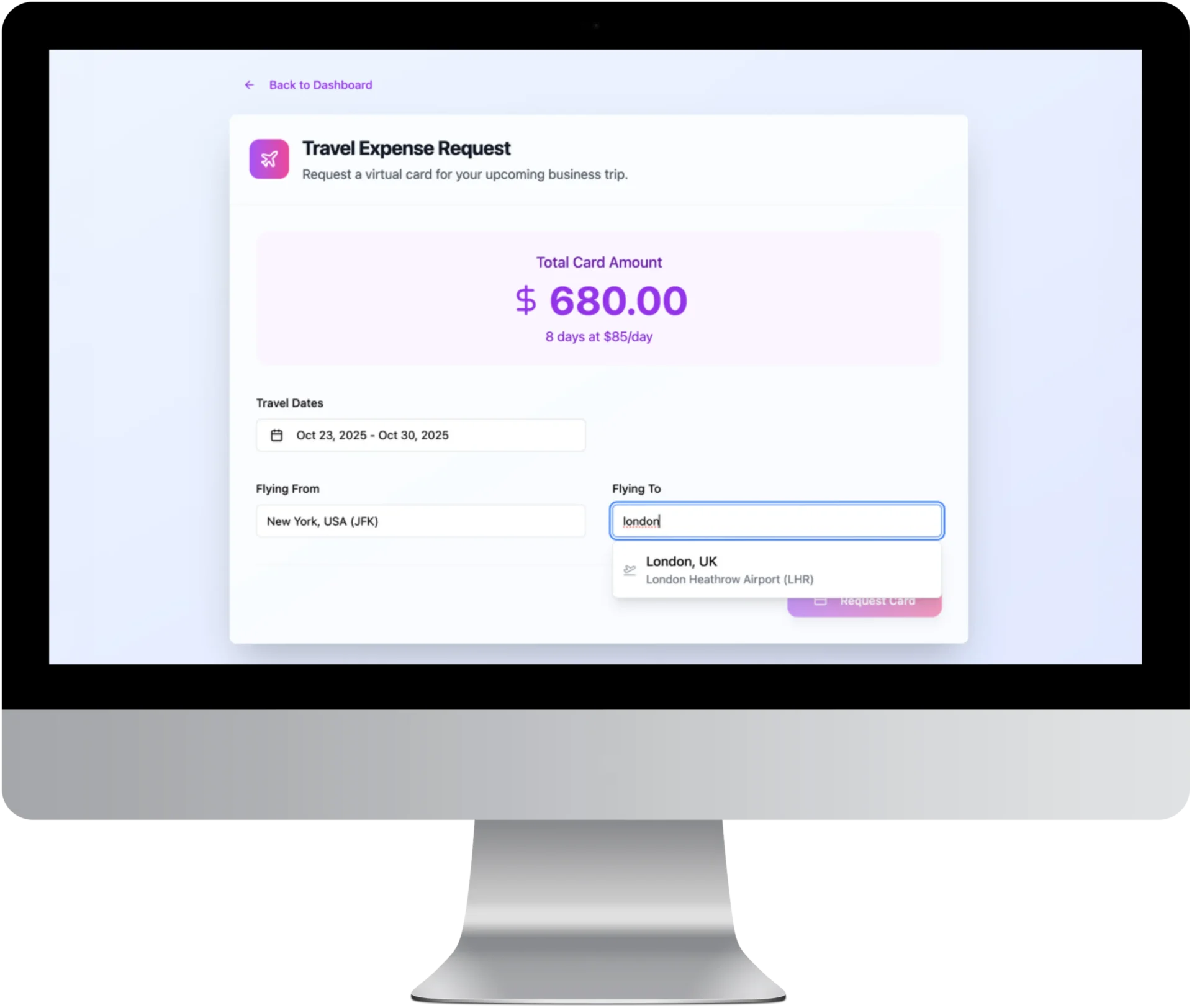 Any team member can log in and request a virtual card for an approved use case - like travel, SaaS, or general spend.